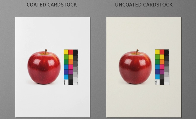 - Coated cardstock: Has a shiny surface that makes colors appear brighter. Available as C1S (coated on one side) or C2S (coated on both sides). Best for photos, brochures, and packaging.