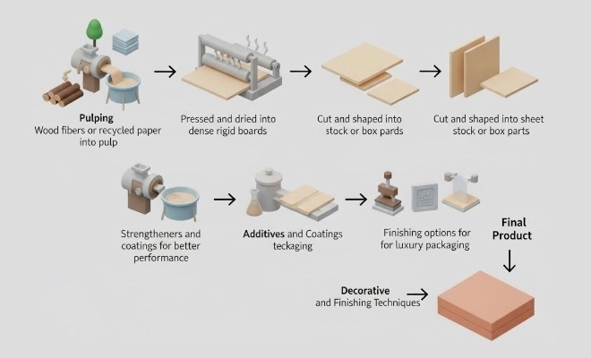Rigid stock is created through a series of steps similar to paperboard production, but with heavier materials and extra finishing options: